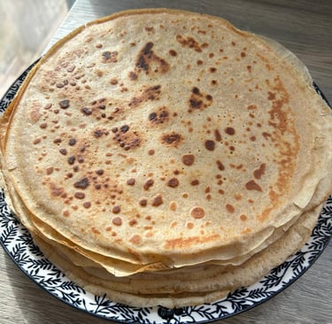 4️⃣ Dans une poêle, verse une louche de pâte et laisse cuire environ 2 minutes de chaque côté, jusqu'à ce que de petites bulles apparaissent à la surface.